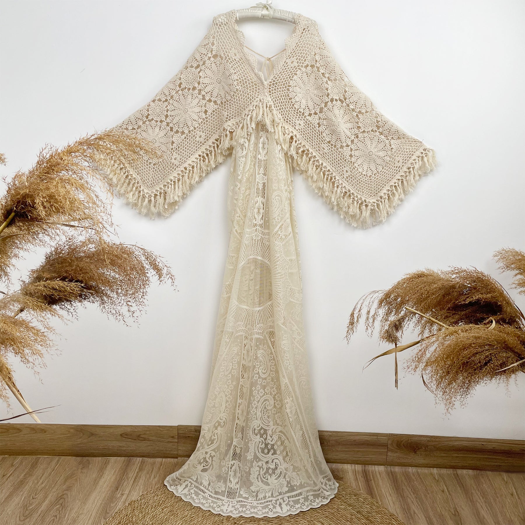 Product name: Photo Shoot Boho Free Size Super Long Sleeves Lace Maternity Gown Embroidery Photography Dress Party Dresses Baby Shower Robe Maternity Couture Nonmaternity Dress Crochet Floral Kaftan