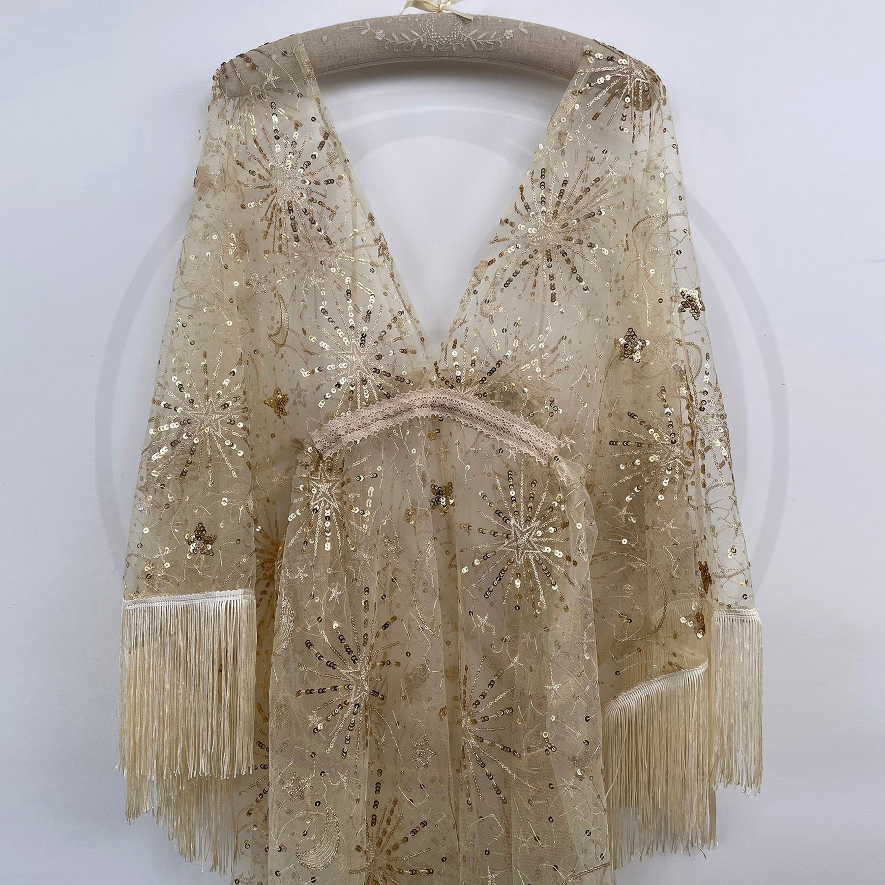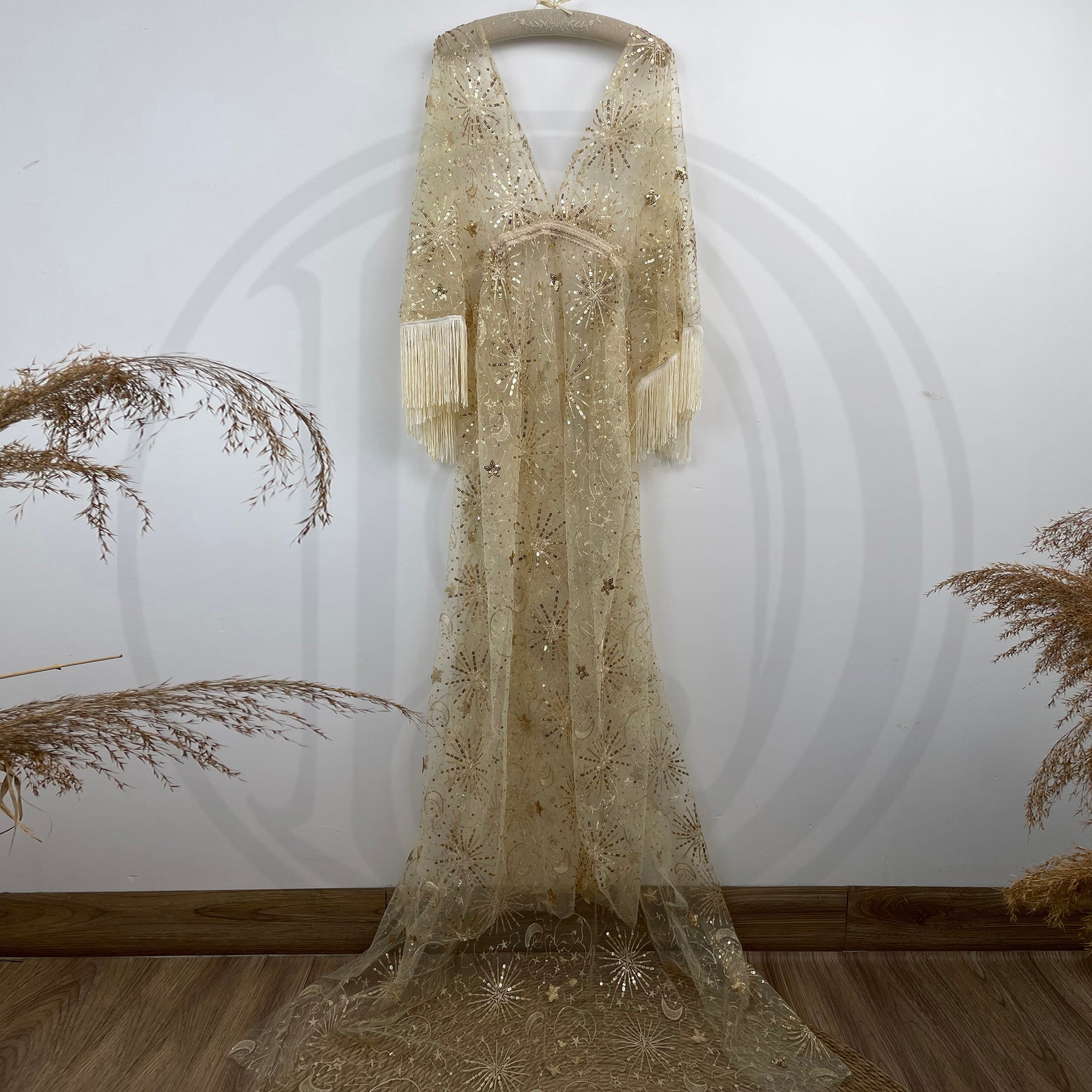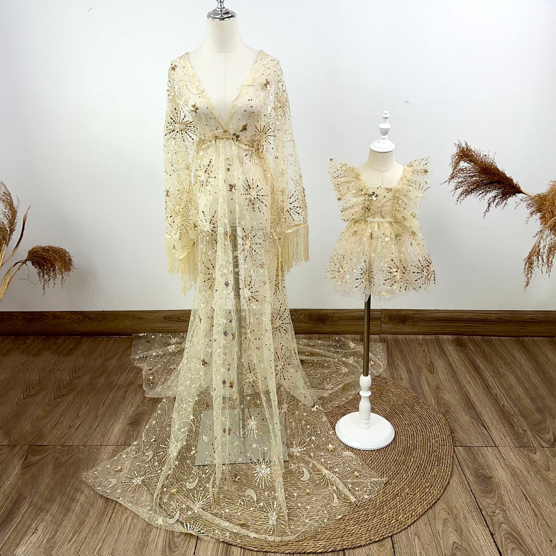 Product name:  Sequence with Embroidery Moon and Star Mommy Gown with Matched Little Gilrs 9-24 Month and 3-6years Old Dress Set Boho Dress Pregnancy Photography Dresses Bohemia Maxi Gown Photo Shoot Prop