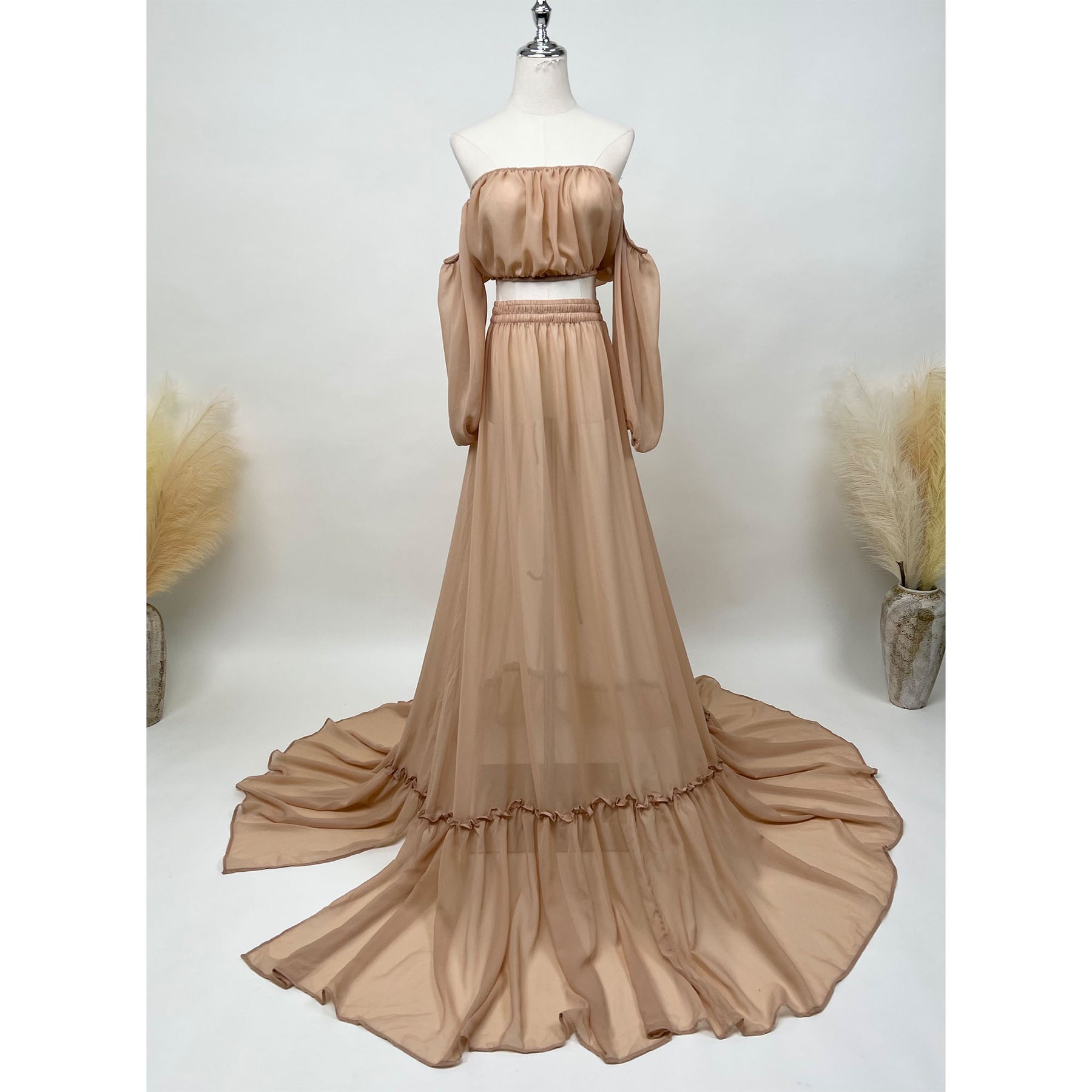 Product name: Chiffon Boho 2 Piece Ruffled Gown Top and Skirt Set Dress Maternity Gown Evening Party Dresses Pregnant for Women Photography Props Baby Shower Gift