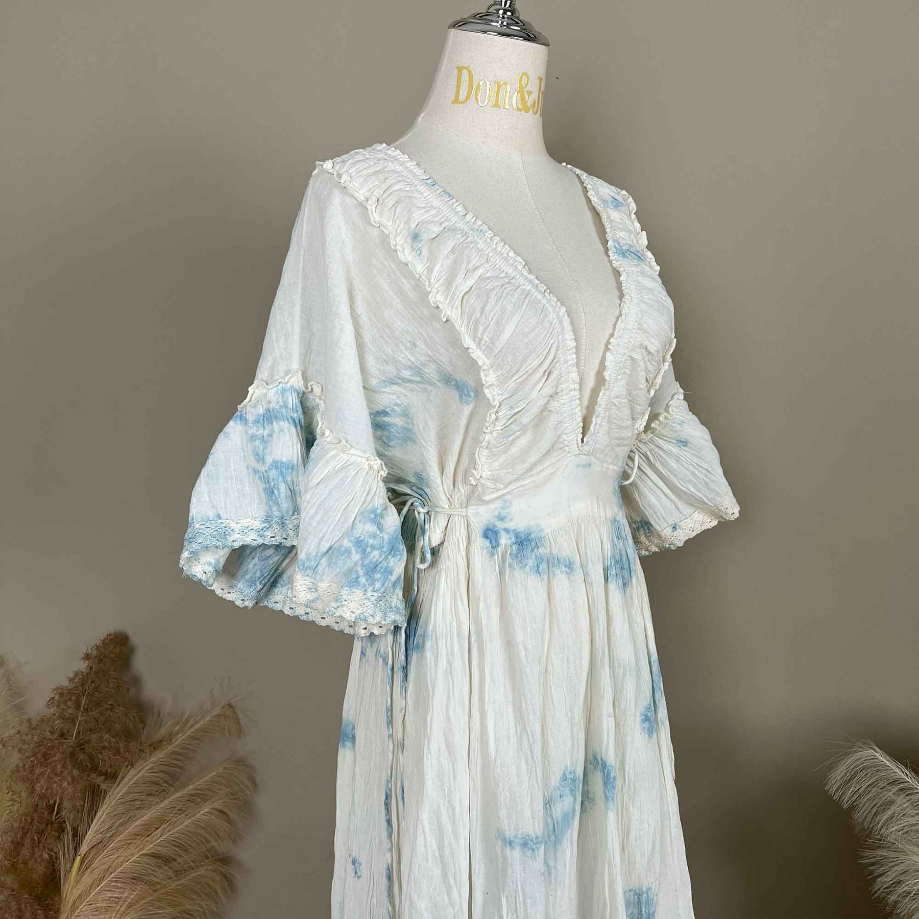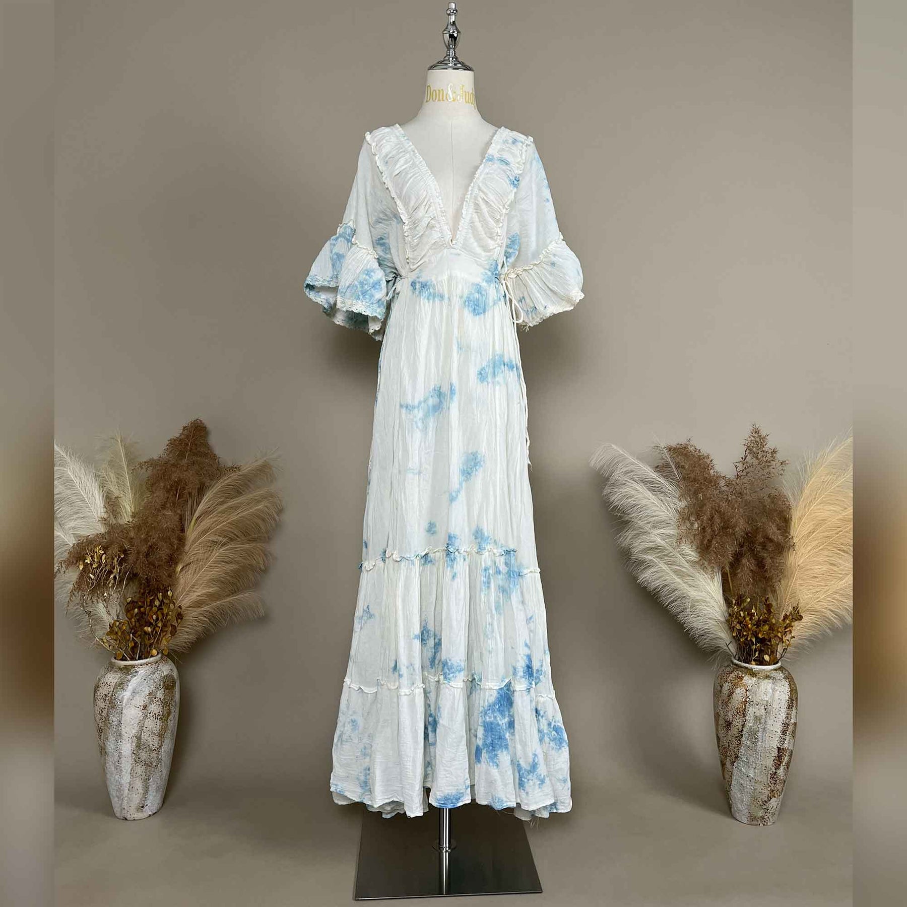Tie-Dye Crinkle Cotton V-Neck Short-Sleeve Maxi Dress Maternity Gown Pregnant Dress Photoshoot Baby Shower