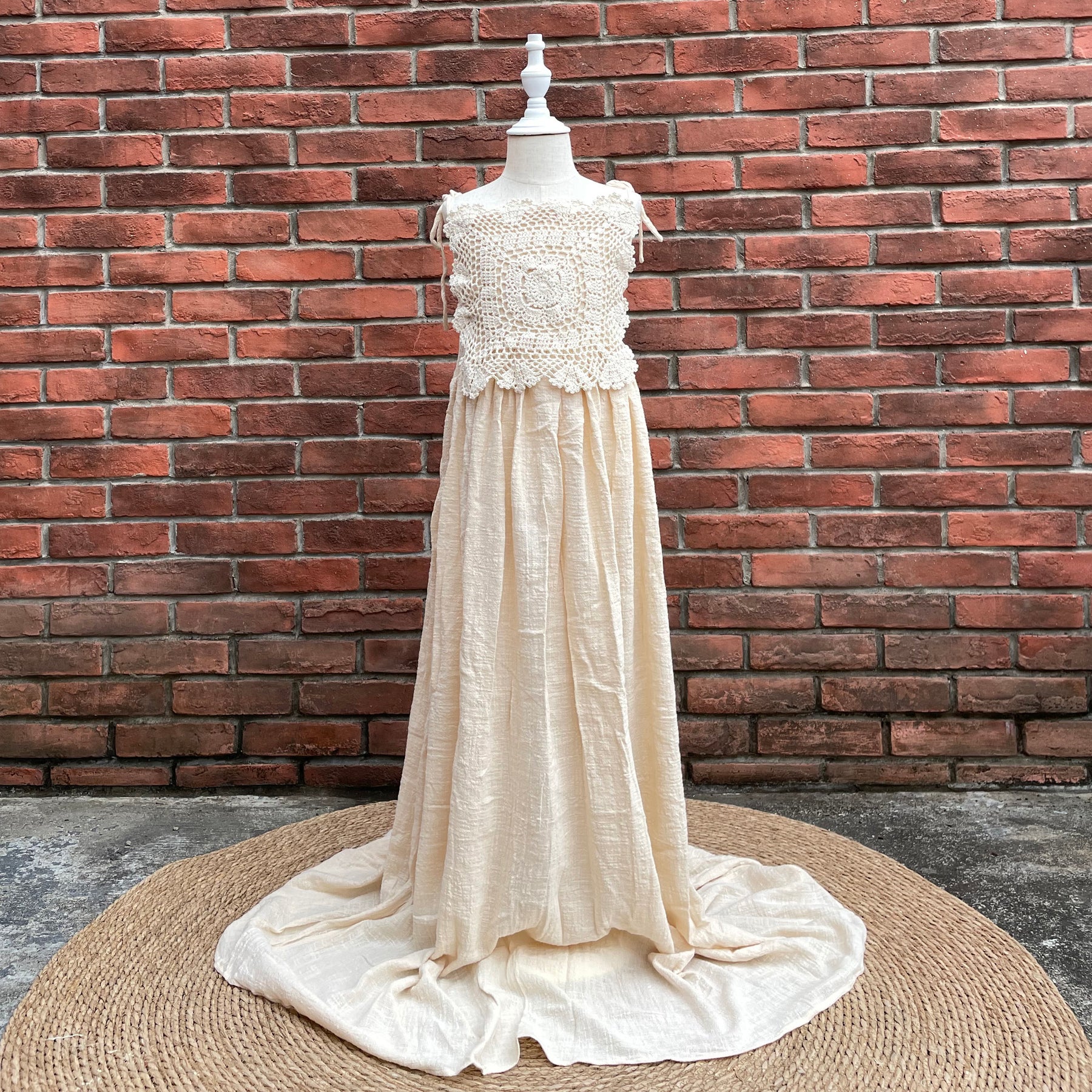 5-6 Years Old Kid Condole Belt Kaftan Free Size Robe Photo Shoot Dress Soft Hand Crochet Floral Cotton Little Girl Princess Casual Gown for Childen Photography Prop Studio